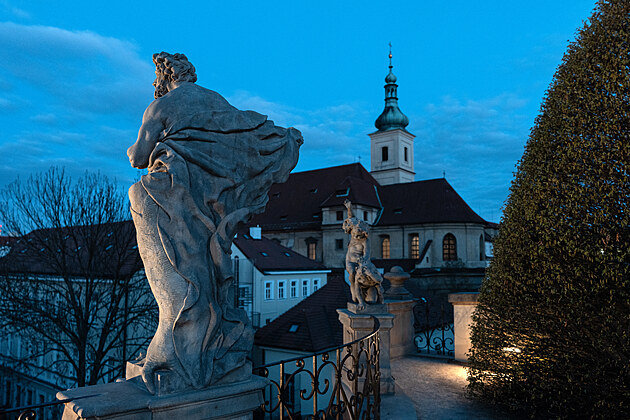 Slavnostně nasvícené sochy ve Vrtbovské zahradě. (9. dubna 2025)