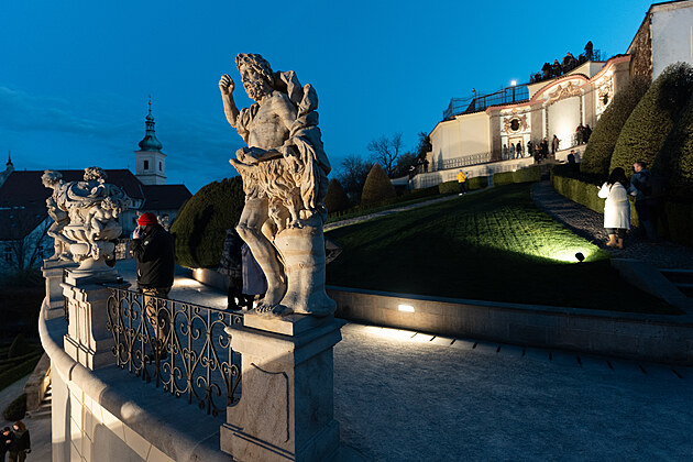 Slavnostně nasvícené sochy ve Vrtbovské zahradě. (9. dubna 2025)
