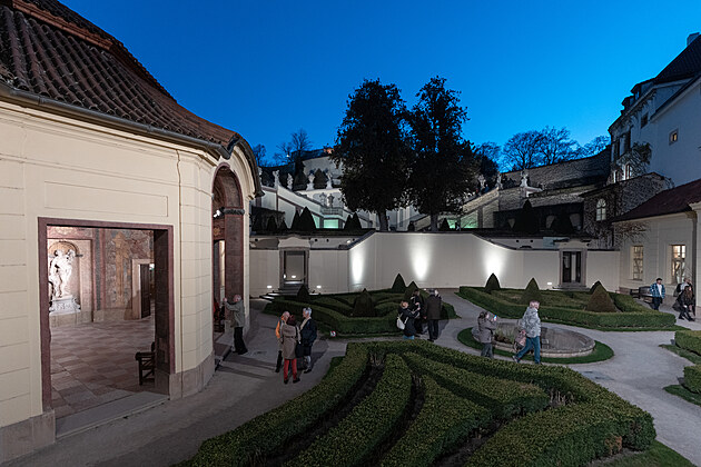 Slavnostně nasvícené sochy ve Vrtbovské zahradě. (9. dubna 2025)