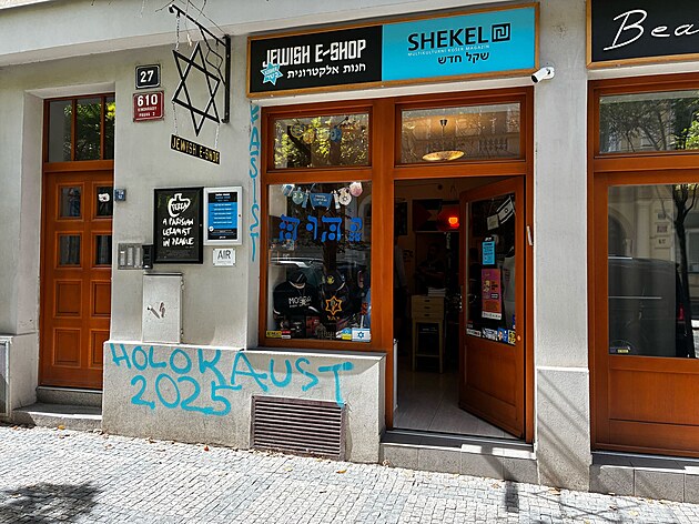 Židovský obchod v centru Prahy na Vinohradech kdosi posprejoval nenávistnými nápisy. (4. září 2025)