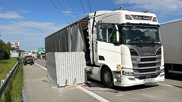 Na Pražském okruhu se tvoří kolona po pádu žulového kvádru z kamionu. (23. května 2025)