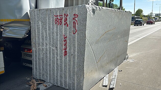 Na Pražském okruhu se tvoří kolona po pádu žulového kvádru z kamionu. (23. května 2025)