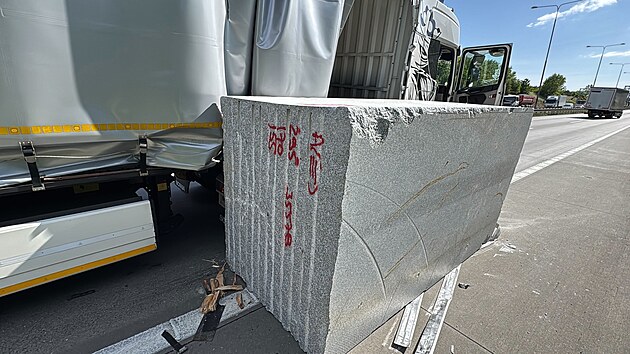 Na Pražském okruhu se tvoří kolona po pádu žulového kvádru z kamionu. (23. května 2025)