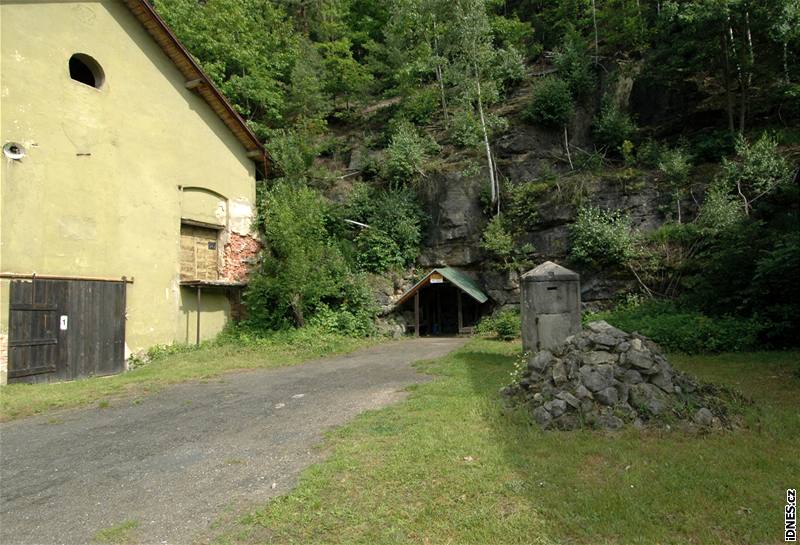 Podzemní továrna v Rabštejně – V pozadí vchod do podzemí „myších dírek", betonová stavba vpravo je protiletecký bunkr pro ostrahu. (snímek z roku 2009)