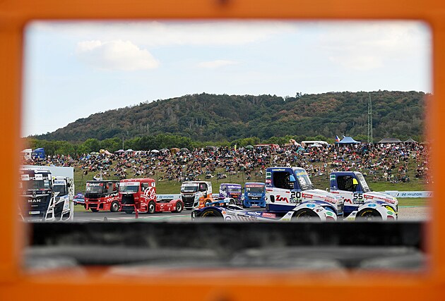 Domácí Adam Lacko (55) a Theo Calvet (20) v závodě trucků na mosteckém autodromu