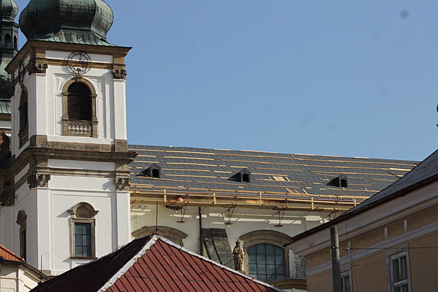 Areál baziliky Panny Marie Sedmibolestné ve čtvrti Bohosudov v Krupce na Teplicku prochází obnovou. Nyní se mění střecha. (duben 2025)