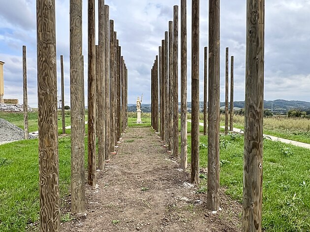 Čtyřicet osm chmelových sloupů rozmístěných ve tvaru kříže a vydlážděný obrys poutního kostela, který byl zbourán před víc než 200 lety. Na poli nedaleko Blšan na Lounsku vznikl nevšední památník. (září 2025)