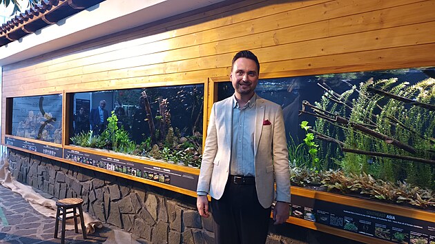 Botanická zahrada v Teplicích má tři nová akvária, která jsou umístěna v tropickém skleníku. Návštěvníci si v nich mohou prohlédnout ohrožené druhy sladkovodních ryb a rostlin. Na snímku ředitel botanické zahrady Petr Šíla. (29. září 2025)