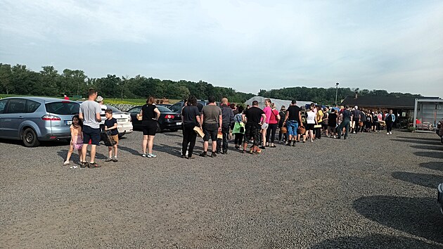 Fronta na samosběr jahod v Brozanech na Litoměřicku. (1. června 2025)