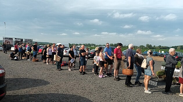 Fronta na samosběr jahod v Brozanech na Litoměřicku. (1. června 2025)