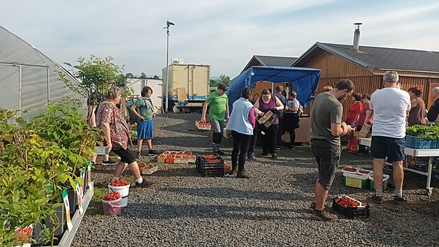 Samosběr jahod v Brozanech na Litoměřicku. V areálu si lze koupit například i sazenice. (1. června 2025)