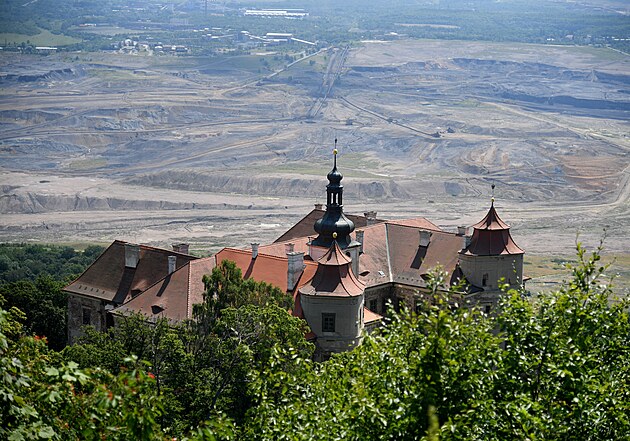Zámek Jezeří a pod ním lom ČSA. (červenec 2024)
