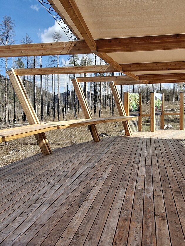Nová vyhlídková plošina s trvalou výstavou velkoformátových fotografií u Mlýnské cesty z Mezní Louky a Mezné k Pravčické bráně (duben 2025)