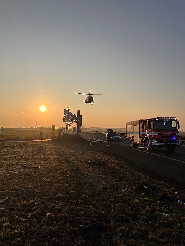 Tragická nehoda u Velemyšlevsi na Lounsku uzavřela dálnici D7 ve směru na Chomutov. Na místě zasahovala i letecká záchranka. (7. března 2025)