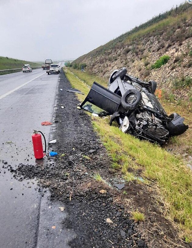 Jeden z řidičů se snažil protijedoucímu vozu na dálnici D7 vyhnout. Jeho auto skončilo na střeše. (28. května 2025)