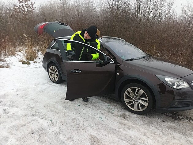 Auta, která parkovala na „plácku“ na exitu 80 u kruhového objezdu Knínice na dálnici D8 nedaleko Ústí nad Labem, zničil vandal. (18. ledna 2025)