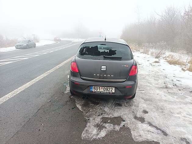 Auta, která parkovala na „plácku“ na exitu 80 u kruhového objezdu Knínice na dálnici D8 nedaleko Ústí nad Labem, zničil vandal. (18. ledna 2025)