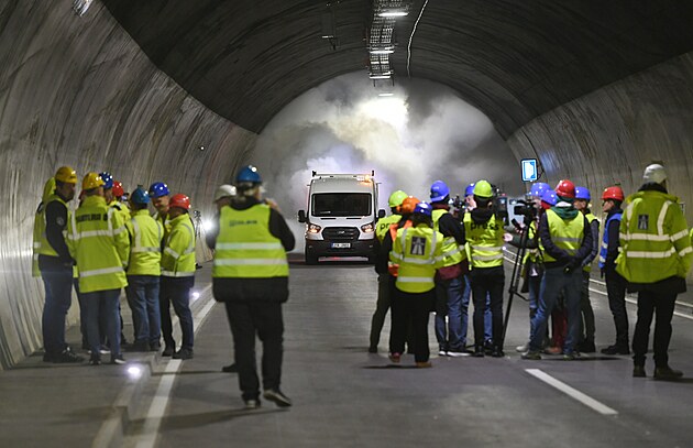 V tunelech Panenská a Libouchec na dálnici D8 u Ústí nad Labem technici provedli požární zkoušky. (7. října 2025)
