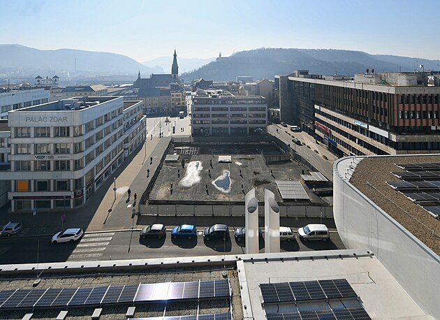 Staveniště na Mírovém náměstí v Ústí nad Labem, kterému se tady neřekne jinak než díra. Město ho koupilo před dvěma lety za 73 milionů s cílem, že tu dostaví polyfunkční dům. Zatím se ale nic neděje. (březen 2025)