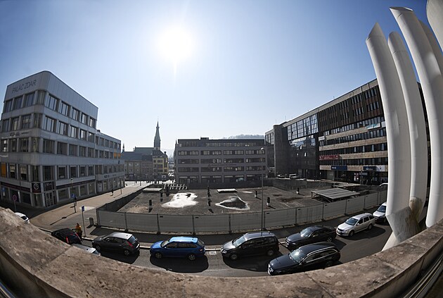 Staveniště na Mírovém náměstí v Ústí nad Labem, kterému se tady neřekne jinak než díra. Město ho koupilo před dvěma lety za 73 milionů s cílem, že tu dostaví polyfunkční dům. Zatím se ale nic neděje. (březen 2025)