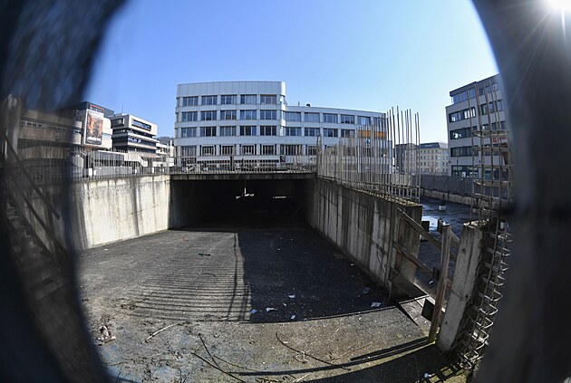 Staveniště na Mírovém náměstí v Ústí nad Labem, kterému se tady neřekne jinak než díra. Město ho koupilo před dvěma lety za 73 milionů s cílem, že tu dostaví polyfunkční dům. Zatím se ale nic neděje. (březen 2025)