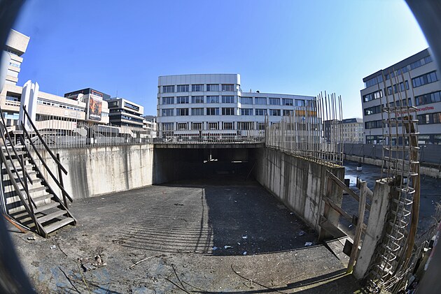 Staveniště na Mírovém náměstí v Ústí nad Labem, kterému se tady neřekne jinak než díra. Město ho koupilo před dvěma lety za 73 milionů s cílem, že tu dostaví polyfunkční dům. Zatím se ale nic neděje. (březen 2025)