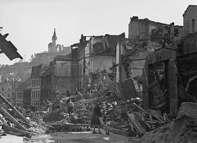 Ulice Malá hradební v Ústí nad Labem po bombardování