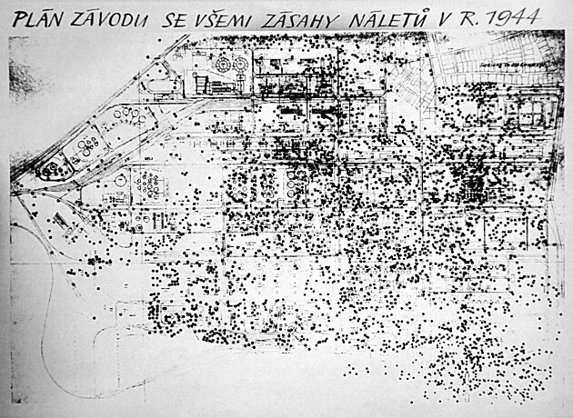 Plán chemičky v Záluží se všemi zásahy náletů v roce 1944