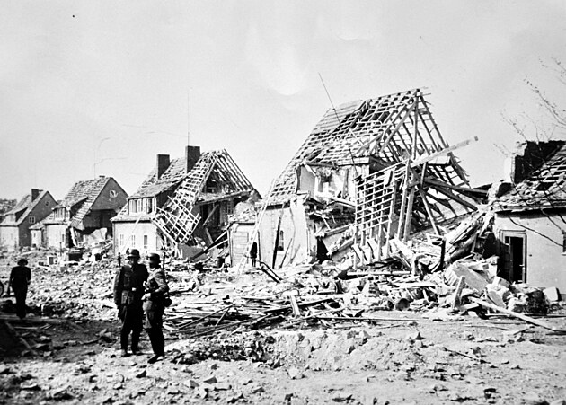 Takzvané pohotovostní domky v Záluží po náletu z 12. května 1944
