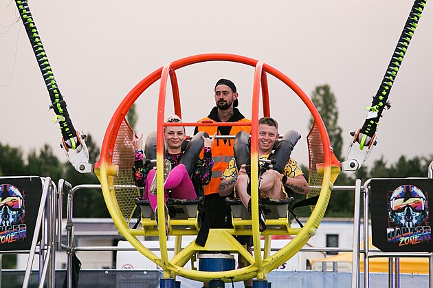 Dva lidé v jediné kovové kouli, okamžik předtím, než je lana vystřelí do vzduchu.