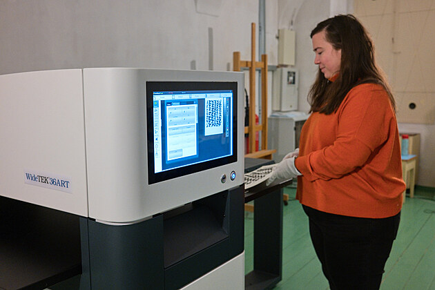 Galerie Benedikta Rejta v Lounech se pustila do digitalizace své rozsáhlé umělecké sbírky. Na snímku digitalizuje kurátorka galerie Michaela Vávrová černobílou grafiku Ivana Chatrného.
