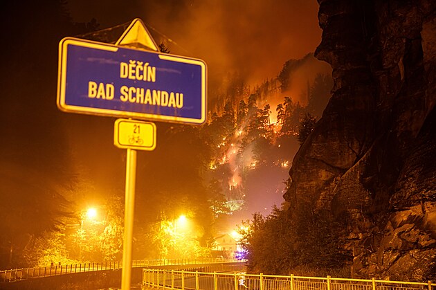 Noční záběry z požáru na Děčínsku (26. července 2022)