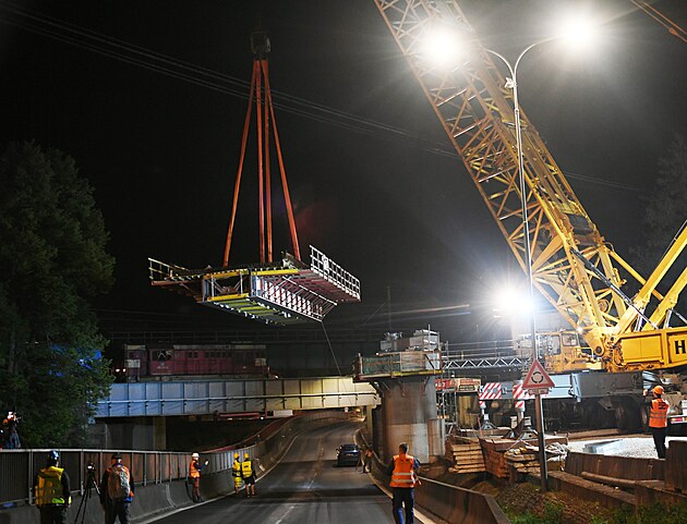 Největší kolový jeřáb v Česku, který je schopný unést až 550 tun, umístil na pilíře železničního mostu přes Střeleckou ulici v Ústí nad Labem novou mostní ocelovou konstrukci. (13. dubna 2024)