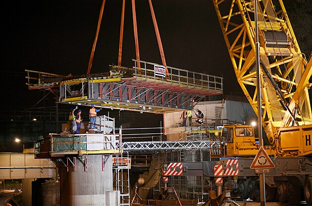 Největší kolový jeřáb v Česku, který je schopný unést až 550 tun, umístil na pilíře železničního mostu přes Střeleckou ulici v Ústí nad Labem novou mostní ocelovou konstrukci. (13. dubna 2024)