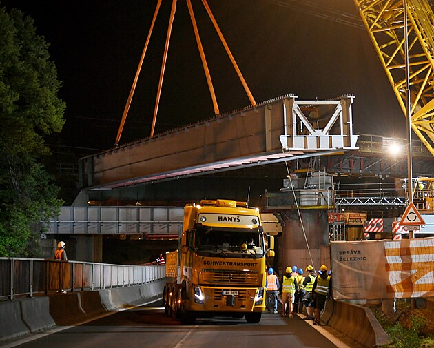Největší kolový jeřáb v Česku, který je schopný unést až 550 tun, umístil na pilíře železničního mostu přes Střeleckou ulici v Ústí nad Labem novou mostní ocelovou konstrukci. (13. dubna 2024)
