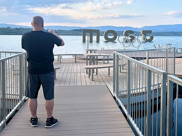 Most vrátil na stejnojmenné jezero obří plovoucí nápis, který se před měsícem potopil pod váhou desítek lidí, kteří na něj i přes zákaz vylézali. Oprava konstrukce stála 250 tisíc korun. (září 2024)