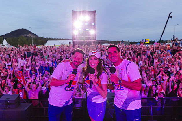 Průvodci Zahájením Olympijského festivalu u jezera Most zleva Jan Smetana, Olga Lounová a Roman Šebrle
