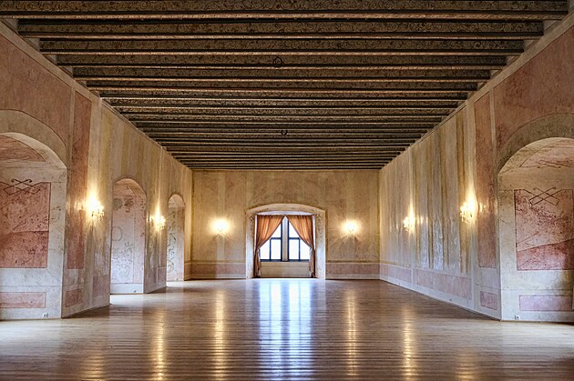 Největší místností na zámku Nový Hrad v Jimlíně je rytířský sál. Restaurátoři tady obnovili historickou výmalbu. (květen 2025)