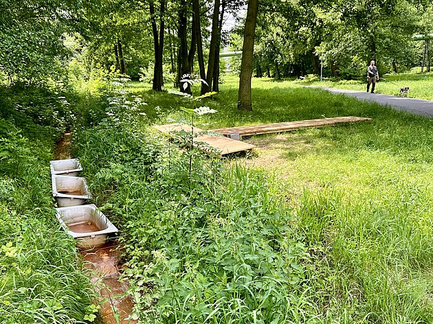 Vany od Veroniky Přibíkové. Tři vany zasazené do železitého koryta potoka evokují archetyp lázeňství a kolektivní očisty.
