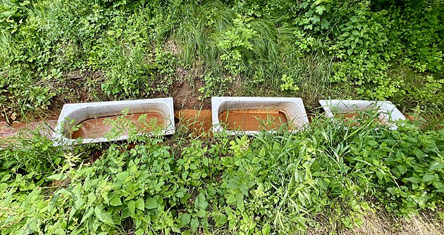 Vany od Veroniky Přibíkové. Tři vany zasazené do železitého koryta potoka evokují archetyp lázeňství a kolektivní očisty.