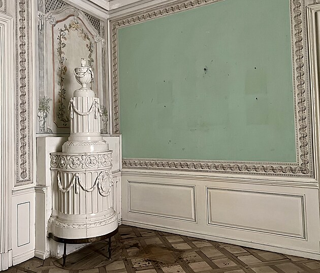 Interiéry zámku v Krásném Dvoře. Některé místnosti musely být vyřazeny z prohlídkového okruhu kvůli výskytu dřevomorky.