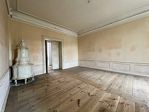 Interiéry zámku v Krásném Dvoře. Některé místnosti musely být vyřazeny z prohlídkového okruhu kvůli výskytu dřevomorky.