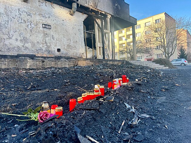 U vyhořelé restaurace v Mostě lidé zapalují svíčky. (13. ledna 2025)