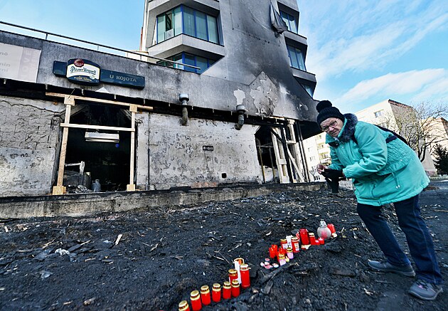 U vyhořelé restaurace v Mostě lidé zapalují svíčky. (13. ledna 2025)
