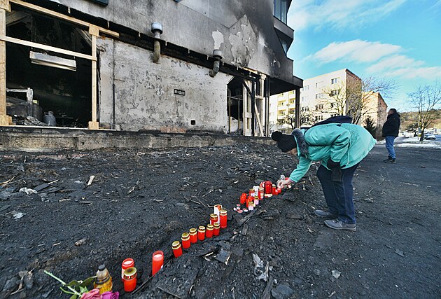 U vyhořelé restaurace v Mostě lidé zapalují svíčky. (13. ledna 2025)