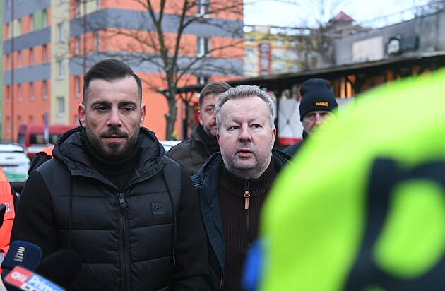 Při výbuchu v restauraci v Mostě uhořelo šest lidí, další jsou zranění. Na místo přijel hejtman Ústeckého kraje Richard Brabec (vpravo). (12. ledna 2025)