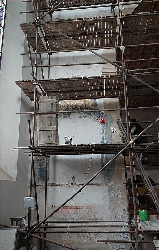 Odborníci v presbytáři objevili malované baldachýny a torza florálních maleb.