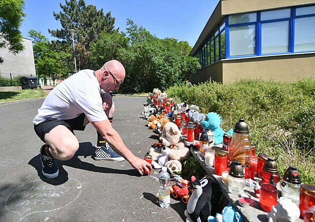 U 14. Základní školy v Mostě, kde útočník zabil malého chlapce, vzniklo pietní místo. (29. května 2023)