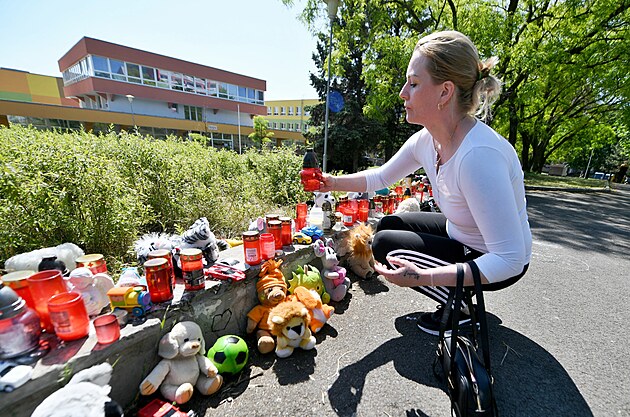 U 14. Základní školy v Mostě, kde útočník zabil malého chlapce, vzniklo pietní místo. (29. května 2023)