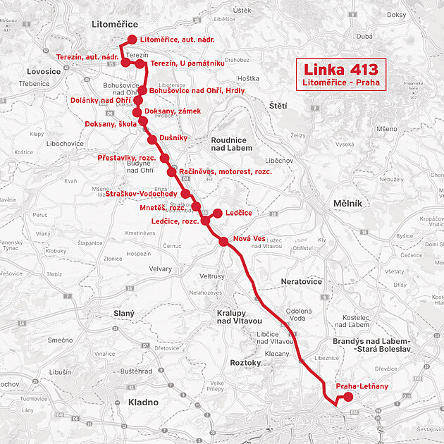 Nová mezikrajská linka se rozjede od soboty 2. září, protože licence stávajícímu dopravci končí 1. září. Nový autobus s číslem 413 bude začínat u stanice metra Letňany a až do Nové Vsi pojede po dálnici D8. Poté obslouží Ledčice, Straškov-Vodochody, Doksany či Terezín, tedy všechny města a obce na trase silnice II/608.